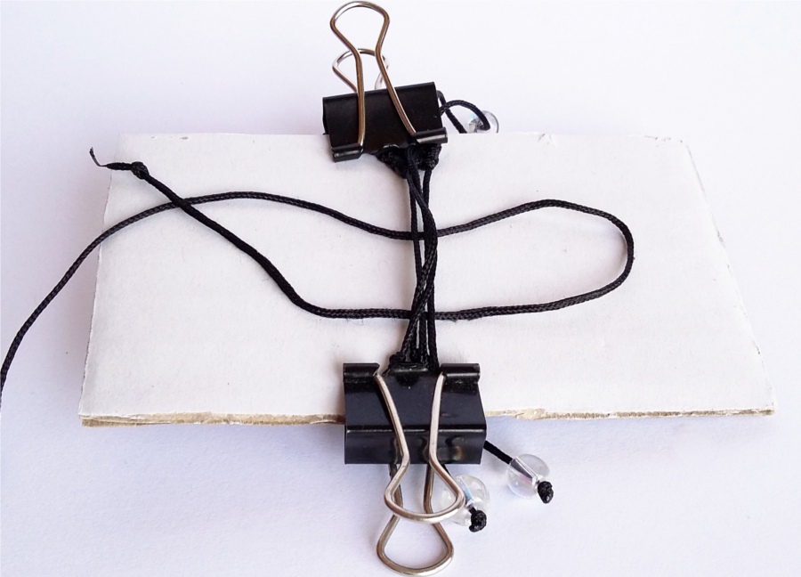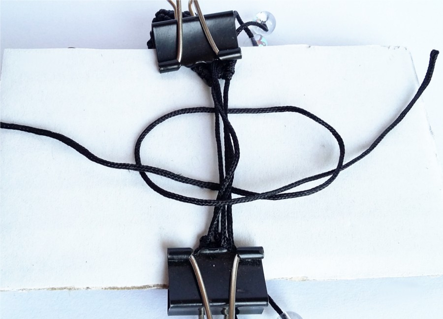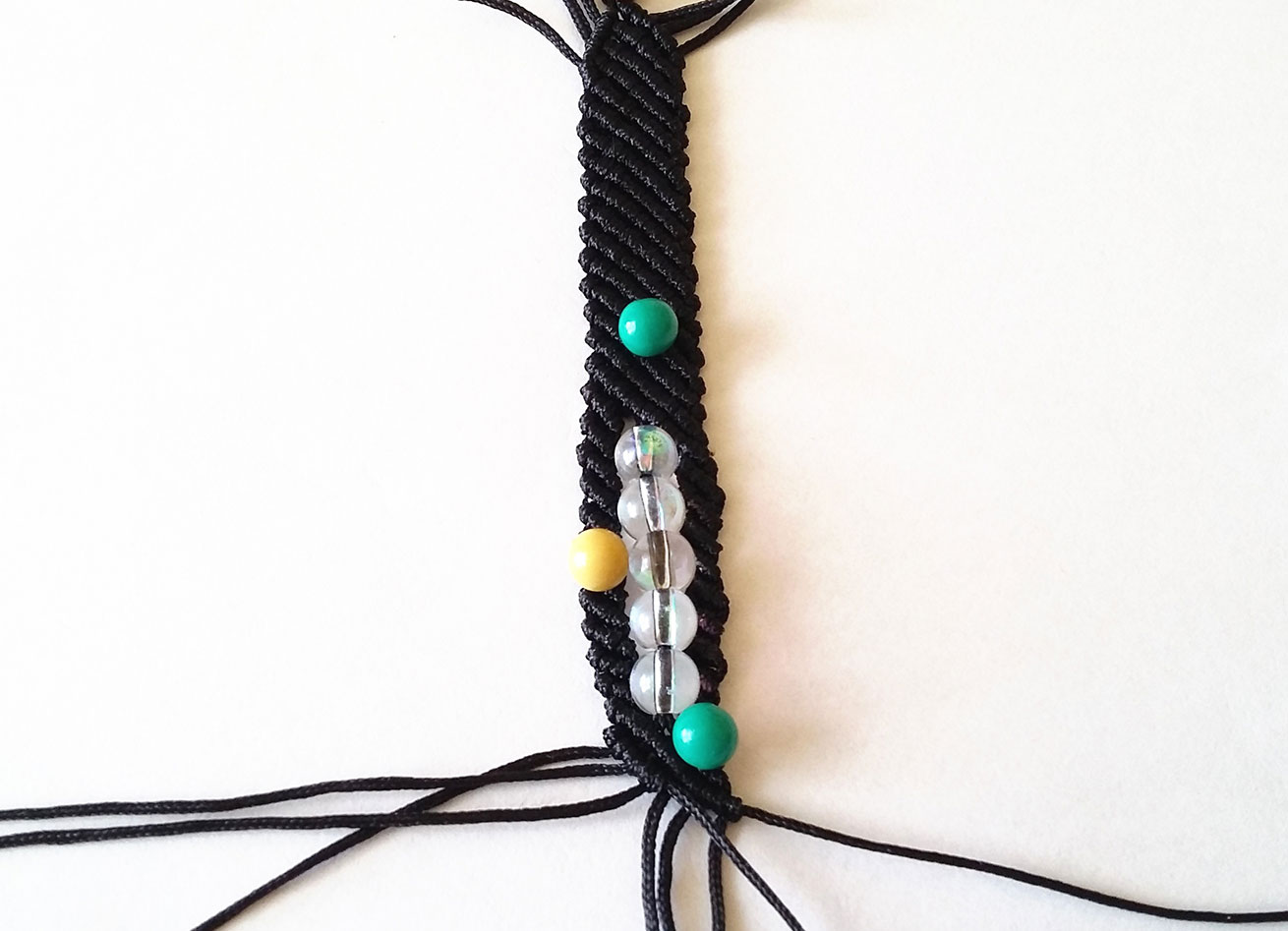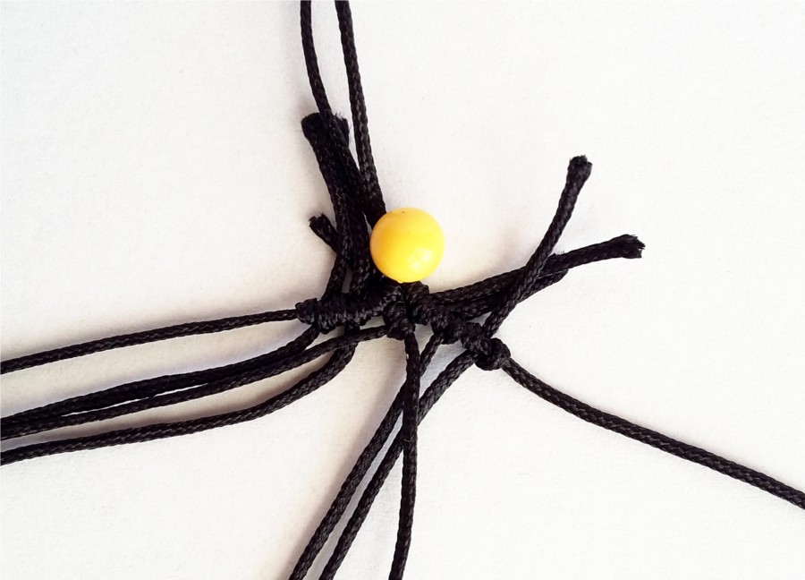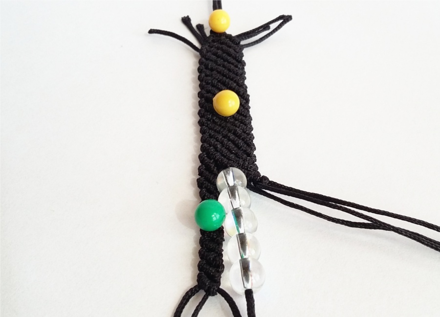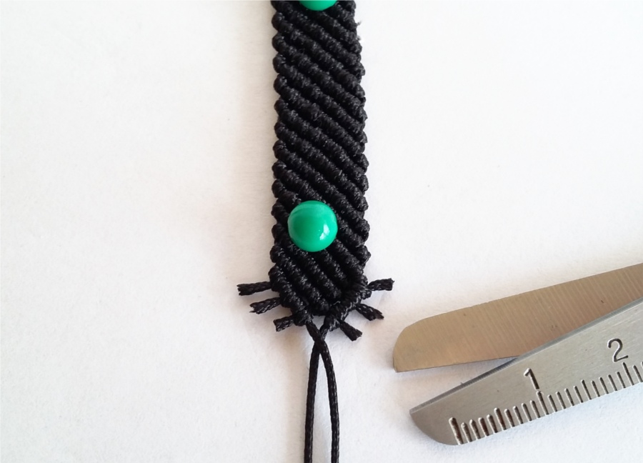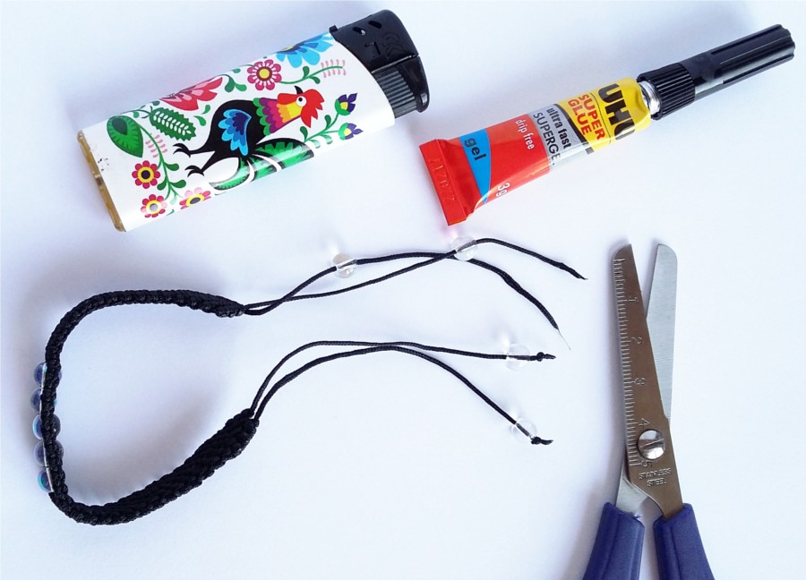 19. Tą samą czynność wykonujemy z drugiej strony naszej pracy. Przycinamy nasze sznurki, które będą tworzyć zapięcie, na podobną długość (około 10cm). Przypalamy końcówki sznurka, nawlekamy koraliki i wiążemy supełki. Delikatnie podklejam supełki klejem, by mieć pewność, że koraliki nie uciekną w trakcie użytkowania. Klej wyciskam na jakąś tekturkę i nakładam przed zaciśnięciem supełka wykałaczką. Odcinam końcówki sznurków i przypalam, by nadać im spłaszczony kształt.