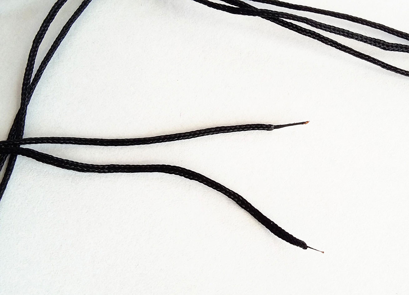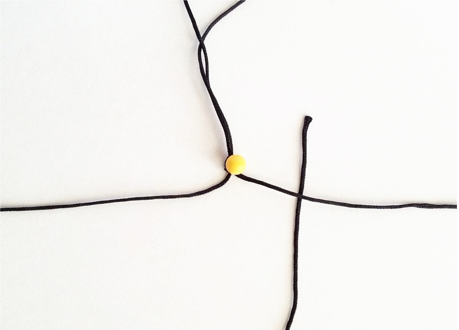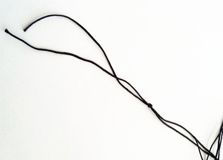Dwa dłuższe (90cm) sznurki wyrównujemy i wiążemy supełek około 15cm od jednego z końców.