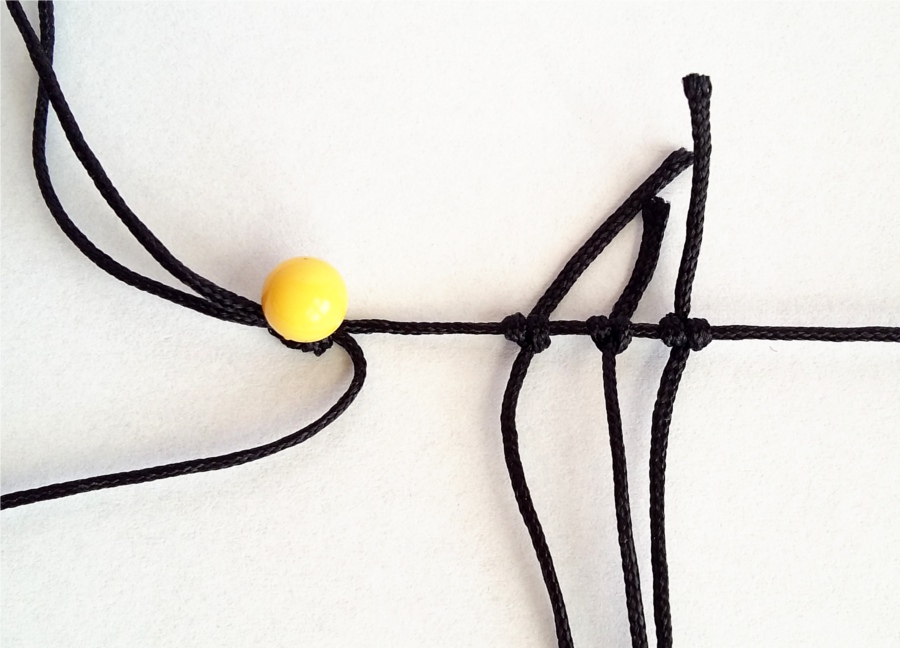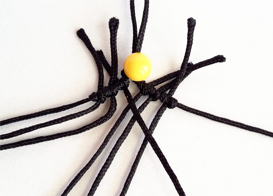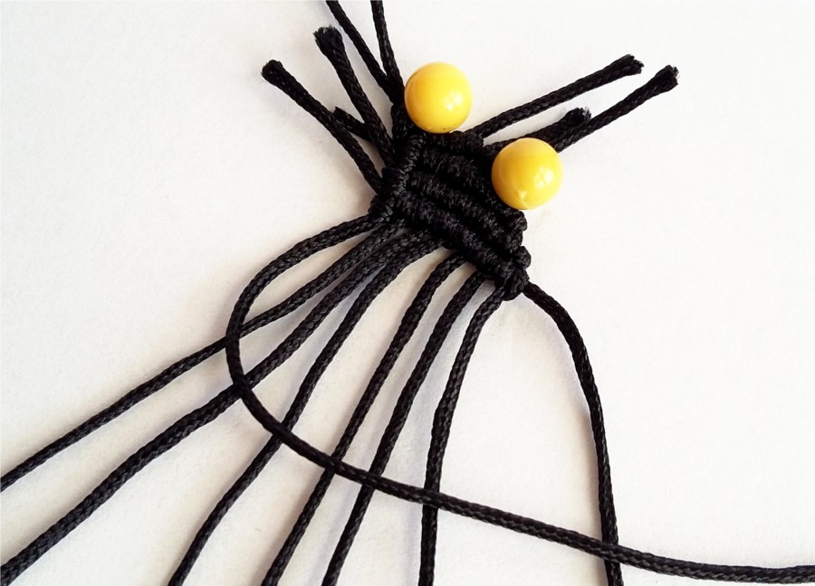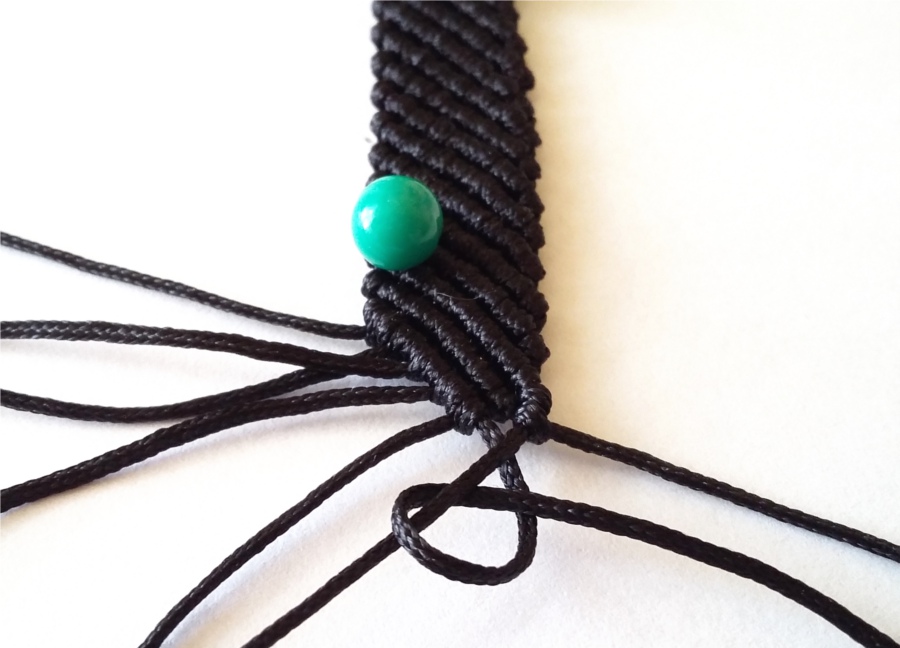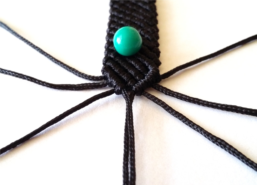 11. I w ten sposób zaplatamy 12 pelnych rzędów węzłów. W kolejnym rzędzie będziemy zaplatać węzły na trzech skrajnych niciach z lewej i prawej stony, a dwie środkowe zostawiamy na przewleczenie koralików.