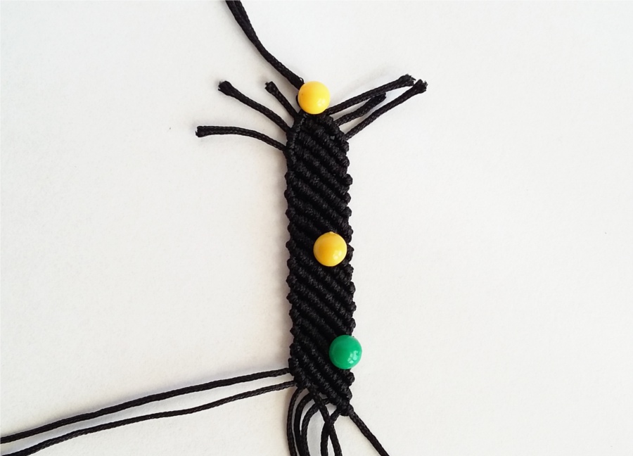 14. Wykonujemy teraz po 11 rzędów węzłów żeberkowych z lewej i z prawej strony, tak, by zrównać się z koralikami, a następnie robimy ponownie 12 rzędów już całych.