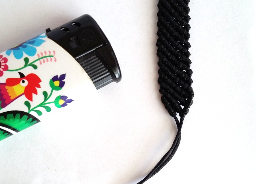 18. A następnie przypalamy zapalniczką i delikatnie dociskamy palcem, by stworzyć coś nam kształt nitu, by nasz supełek się nie rozwiązał. Uważajcie przy tym, by się nie poparzyć, bo sznurek jest gorący.