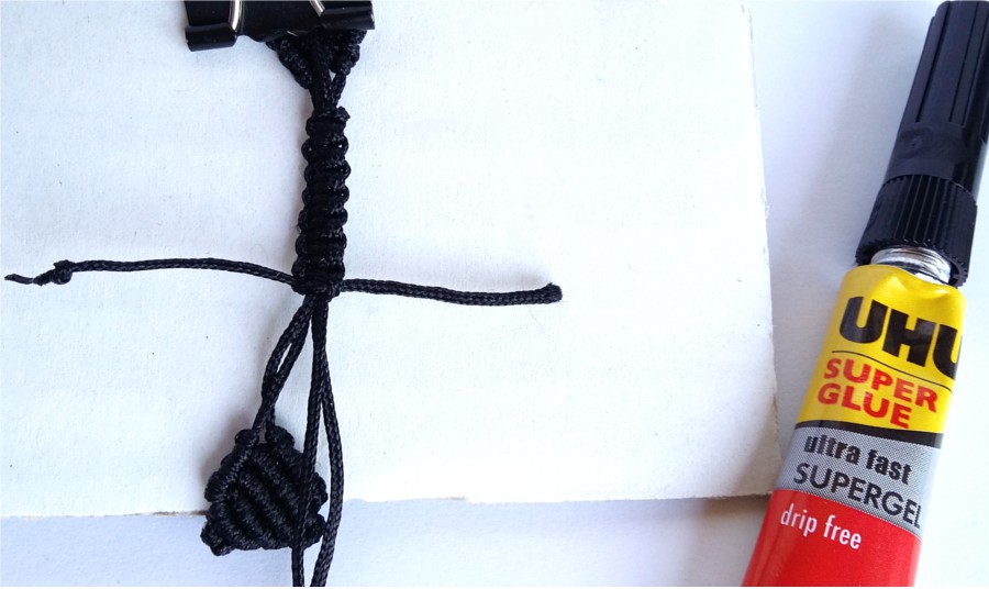 23. Po zrobieniu około 14 węzłów ostatnie dwa podklejam delikatnie klejem, uważając by nie skleić sznurków bransoletki.