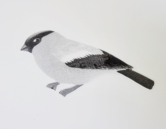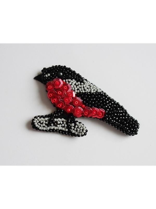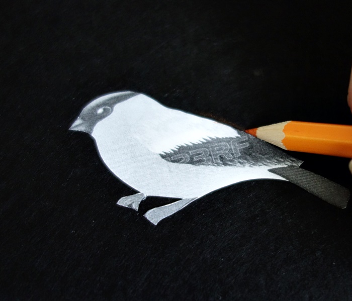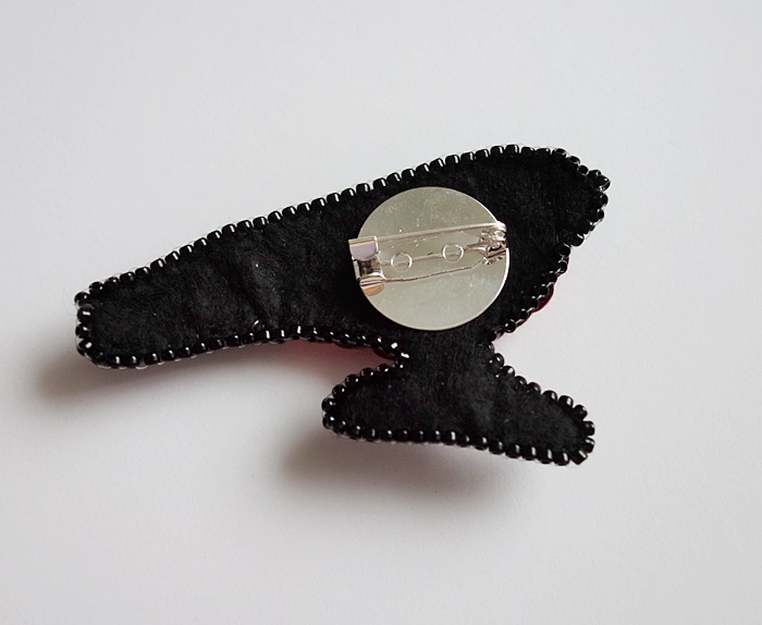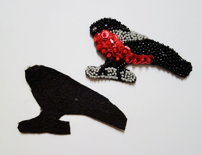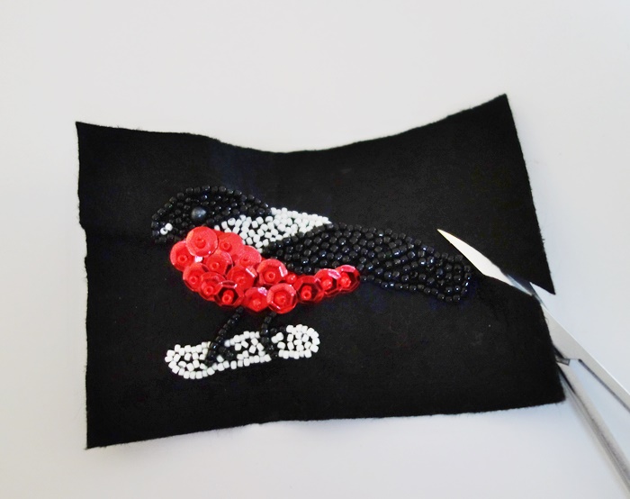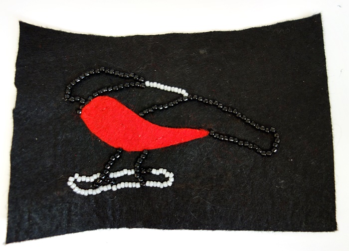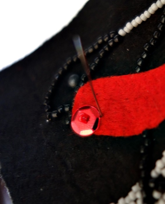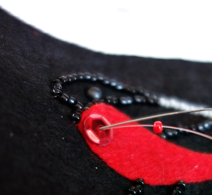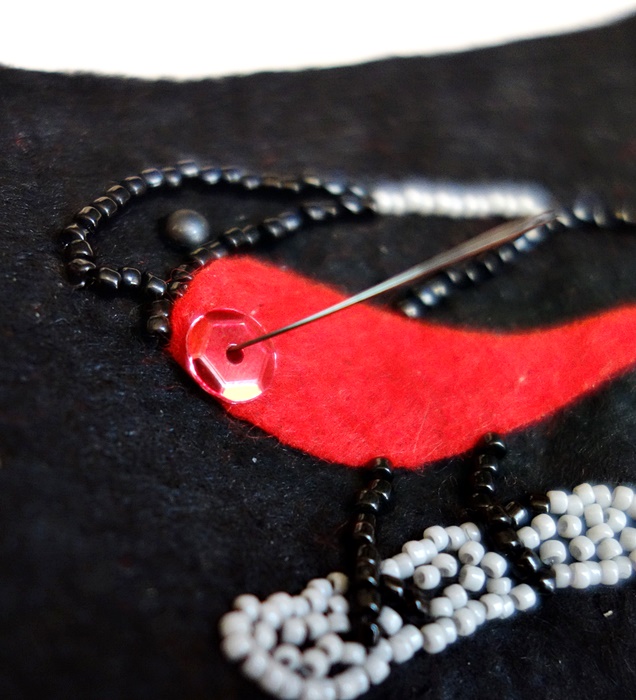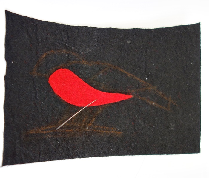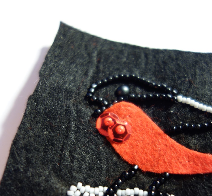 5. Wycinamy z czerwonego filcu brzuszek ptaka i mocujemy dwoma przeszyciami do wzoru.