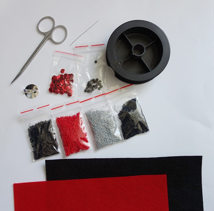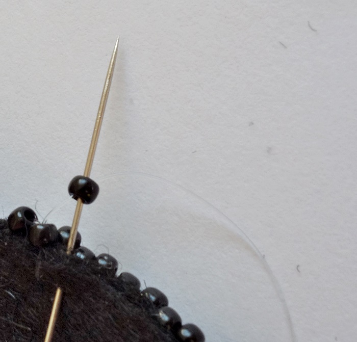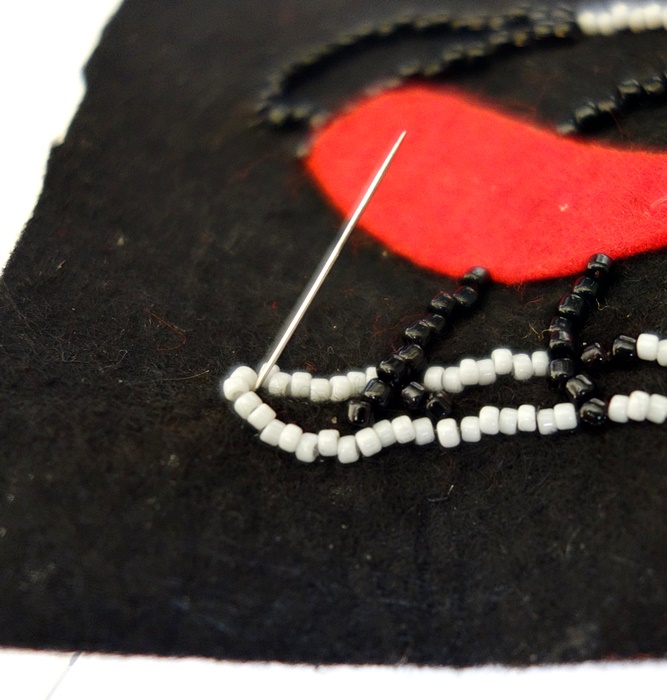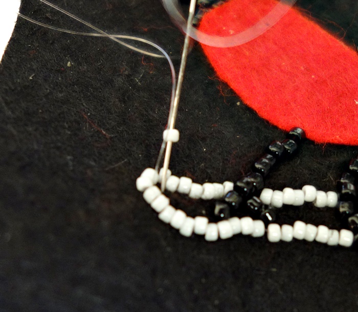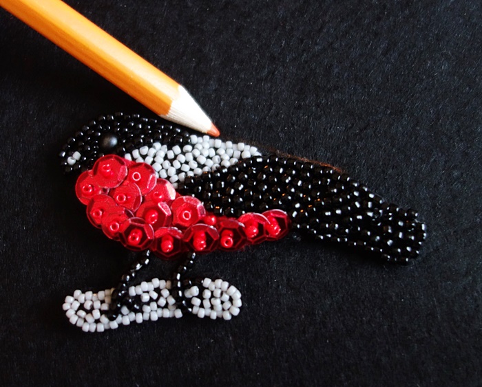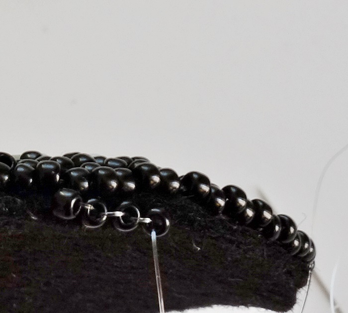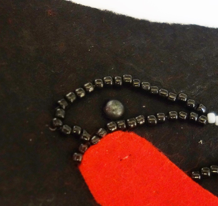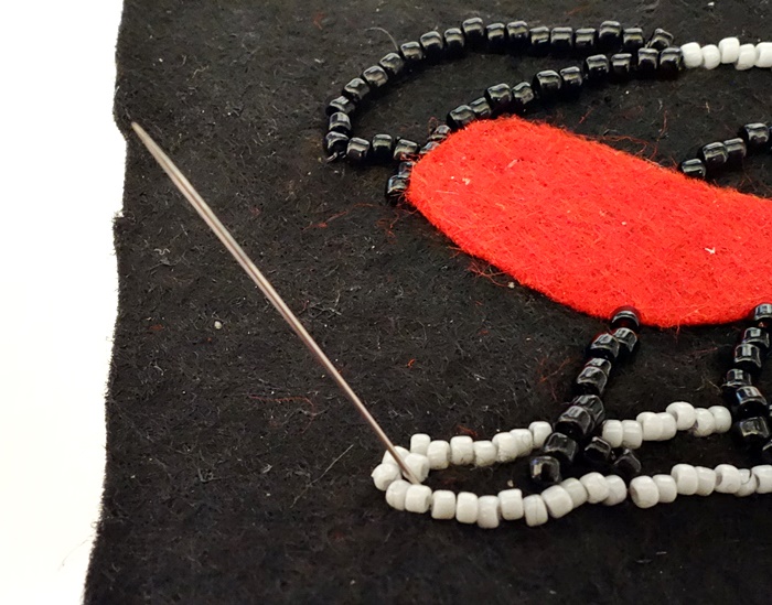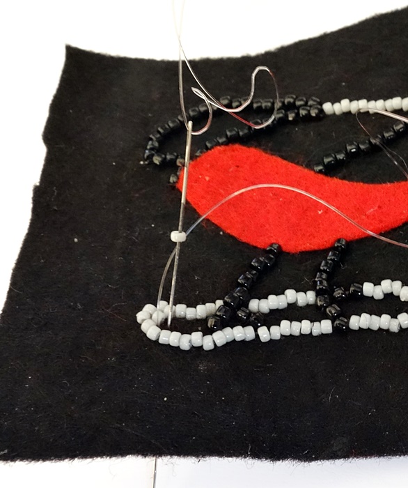 14. Następnie wypełniamy kontury poprzez przyszycie pojedynczych koralików. Wykonujemy przeszycie bez koralika żeby wzmocnić mocowanie nici i wkłuwamy się igłą od spodu pracy.