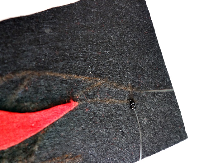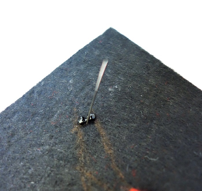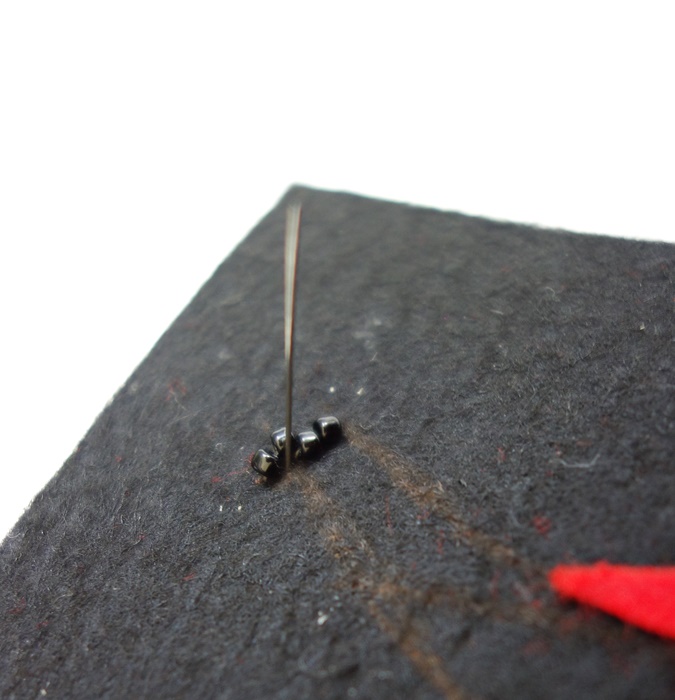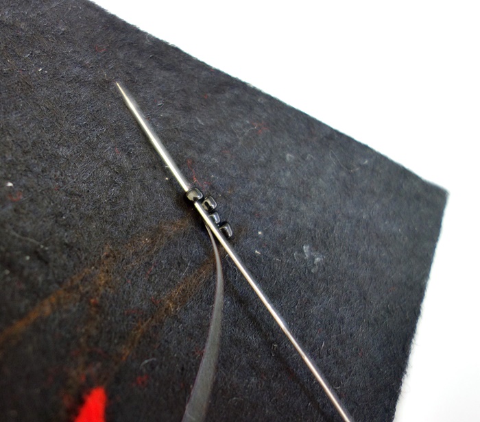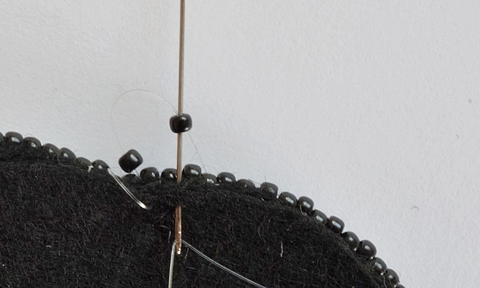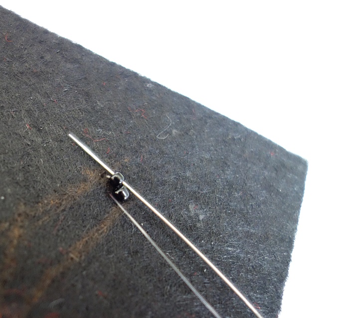 6. Wykonujemy przeszycie bez koralika żeby wzmocnić mocowanie nici, a następnie wkłuwamy igłę od spodu pracy i nabieramy dwa koraliki.