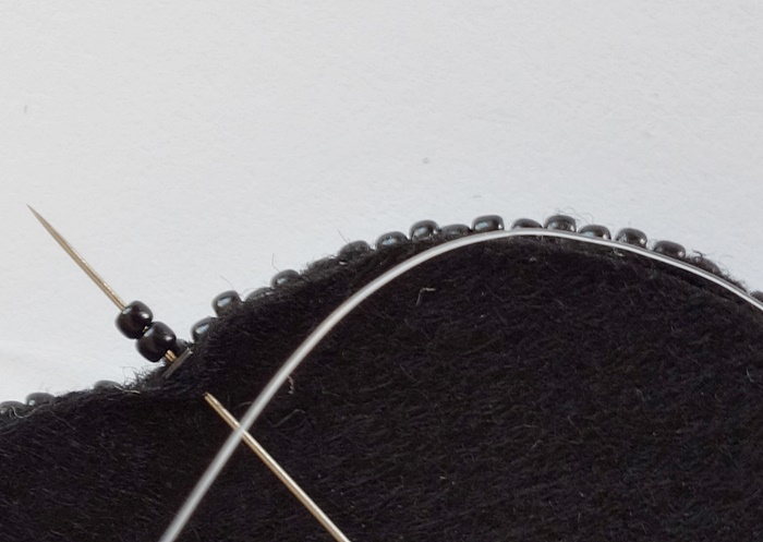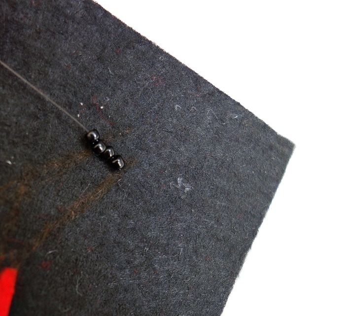 25. Przykładamy "tył" do naszej pracy i wkłuwamy się igłą od strony spodu konturu pracy i nabieramy 2 koraliki.