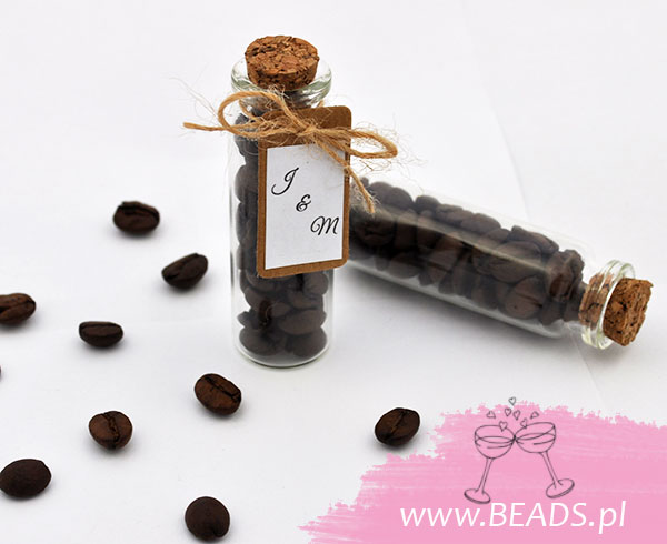 Organizujecie ślub i wesele ? Przygotowaliśmy dla Was zbiór inspiracji związanych z tą tematyką. Oto pierwsza z nich: szklana buteleczka 67 mm z ziarnami kawy, która będzie eleganckim upominkiem dla Waszych Gości weselnych. Do tego etykieta z Waszymi inicjałami, kawałek sznurka jutowego zawiązanego na kokardkę i upominek jest już gotowy. Kawę można zastąpić również liśćmi naszej ulubionej, smakowej herbaty.