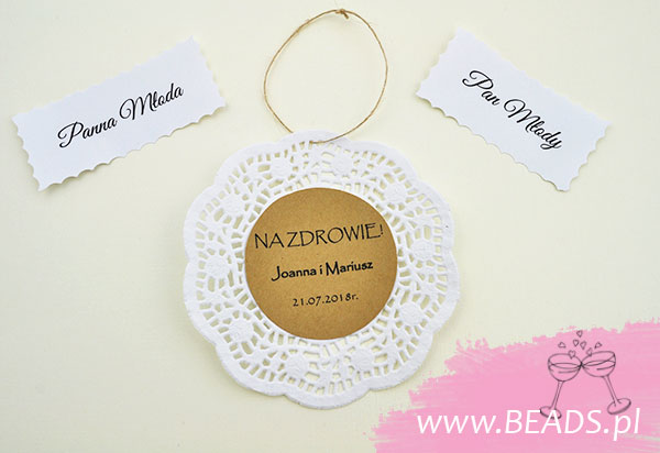 Druga propozycja. Zwykłą butelkę z winem możecie ozdobić weselną etykietą z miłym słowem kierowanym do Gości. Wystarczy biała serwetka, etykieta z napisem, sznurek jutowy i etykieta na alkohol jest już gotowa. Proste, szybkie i efektowne.
