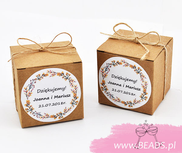 Oto nasza trzecia propozycja weselna. Dno tekturowego pudełka możecie wypełnić rafią dekoracyjną i włożyć do środka cukierek dla Gości. Całość wystarczy obwiązać sznurkiem jutowym i nakleić na przód Waszą weselną etykietę z podziękowaniami. Ten pomysł jest baaaardzo elegancki i świetnie się wkomponuje w styl wesela rustykalnego.