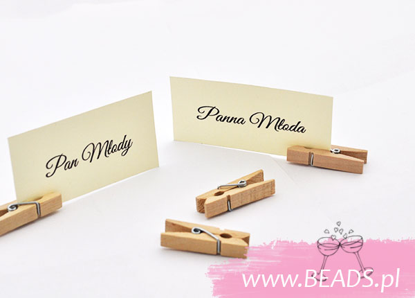 Nie możecie znaleźć odpowiednich winietek ? Zróbcie je sami! Wystarczy wydrukować wszystkie imiona i nazwiska Waszych Gości na papierze w wybranym przez Was kolorze, wyciąć je w równe prostokąty i zaczepić drewniany spinacz. Jest on świetną podstawą. Białe i beżowe winietki najlepiej komponują się z drewnianym spinaczem i również będą idealnym dopełnieniem wesela w stylu rustykalnym.